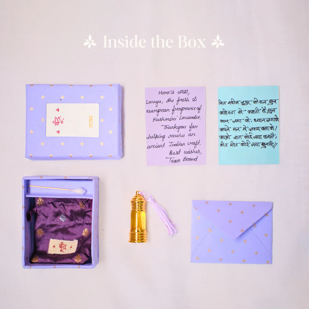 The Lavya fragrance brings the fresh, evergreen scent of Kashmiri Lavender. Handcrafted by artisans to evoke a delicate calm & beautiful feeling. Simply rub a few drops on your palm and dab it on your clothes or behind your ears for a soothing and serene experience.