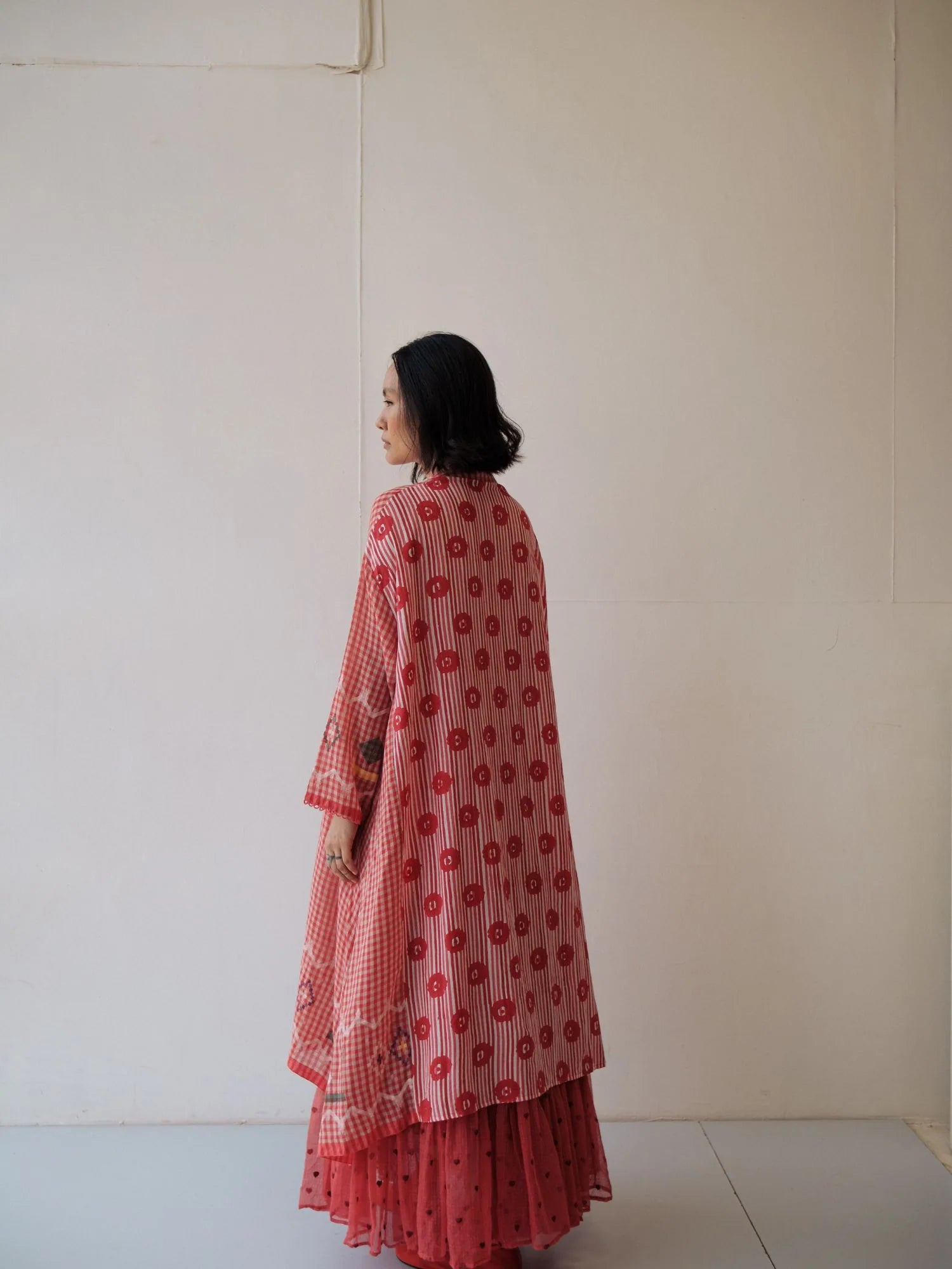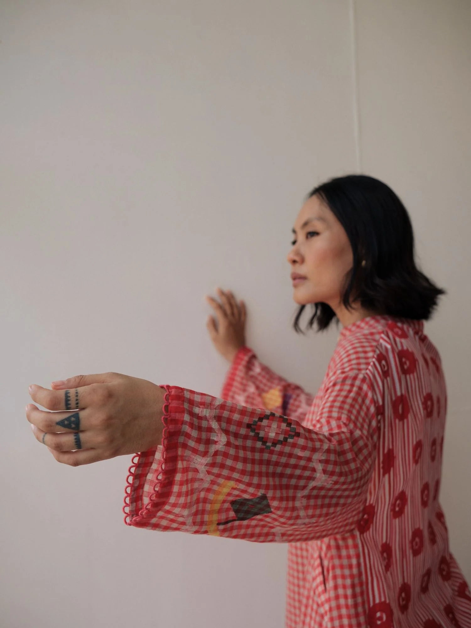 This dress is an example of true craftsmanship with its combination of techniques. The front and sleeves are made from handspun and handwoven Jamdani from Bengal. The back has a panel of hand block printed cotton and the sleeve edges are finished with hand embroidered scallops. It features a mandarin collar and front pockets.