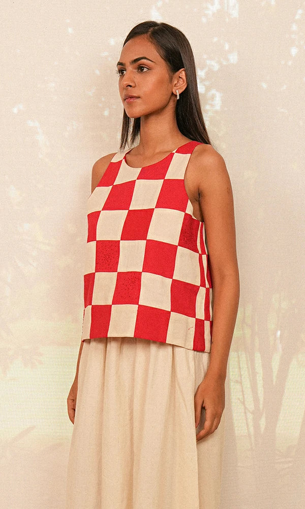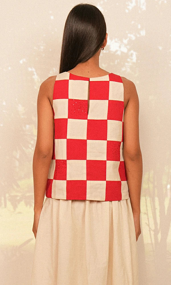 a short, round-neck top featuring square patchwork in two colors (red and white). It is further embellished with sequin and bead embroidery in a geometric pattern.