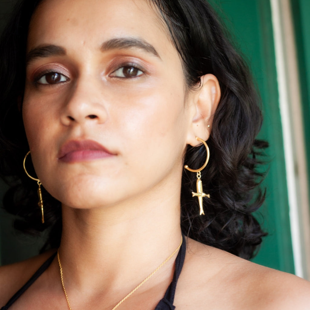Timeless hoops with the traditional cross reimagined as fish in graceful confluence through the ocean. Three fish navigate as one - a powerful symbol of solidarity and finding strength through connection.