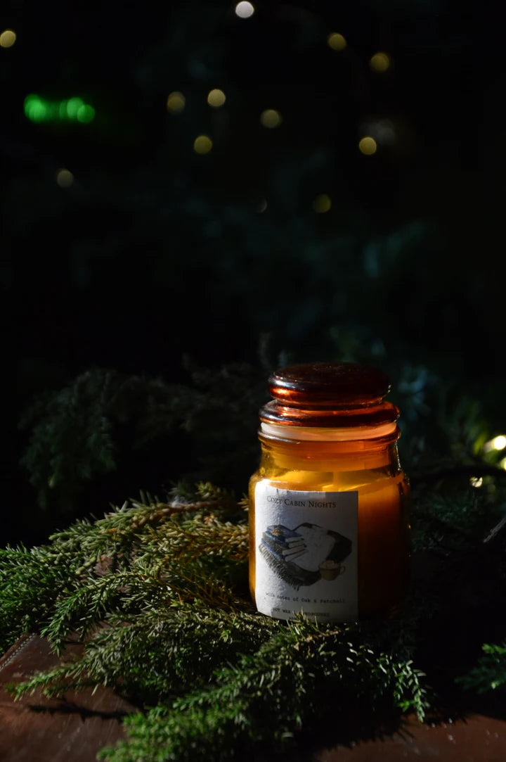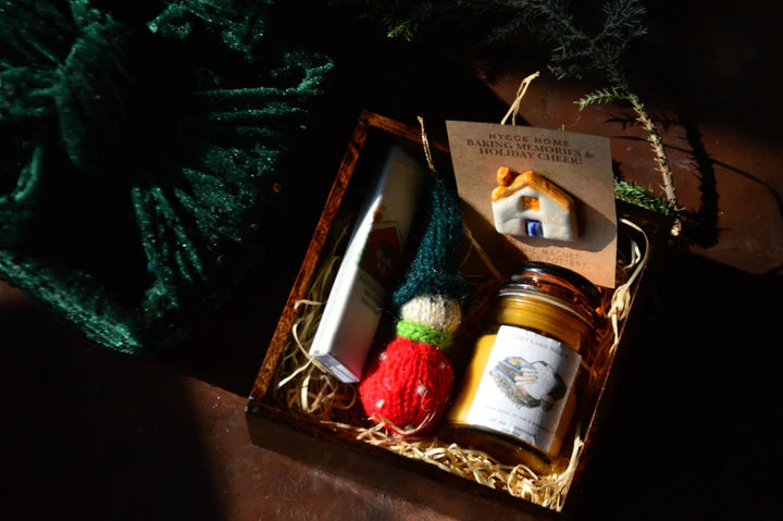 A velvet sequin furoshiki wrap over a wooden crate with a handknit Joy the Pixie ornament, a cottage magnet, a long match box and a Cozy Cabin Nights cookie jar candle.