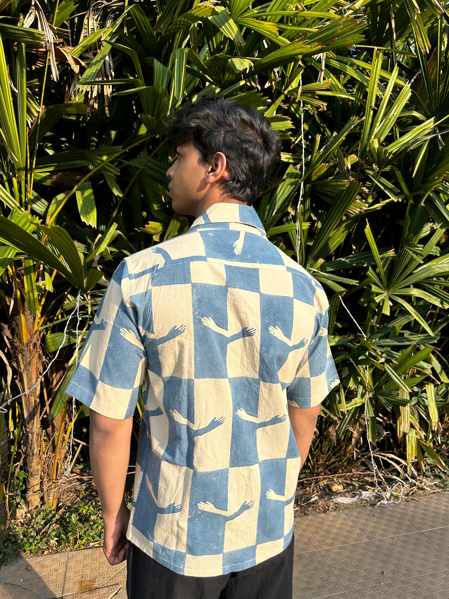 This shirt is made with handwoven cotton fabric, produced by our weavers in Gujarat. The unique printing on the shirt is executed by our artisans, who have blended contemporary design with traditional printing techniques, resulting in a truly distinctive piece.