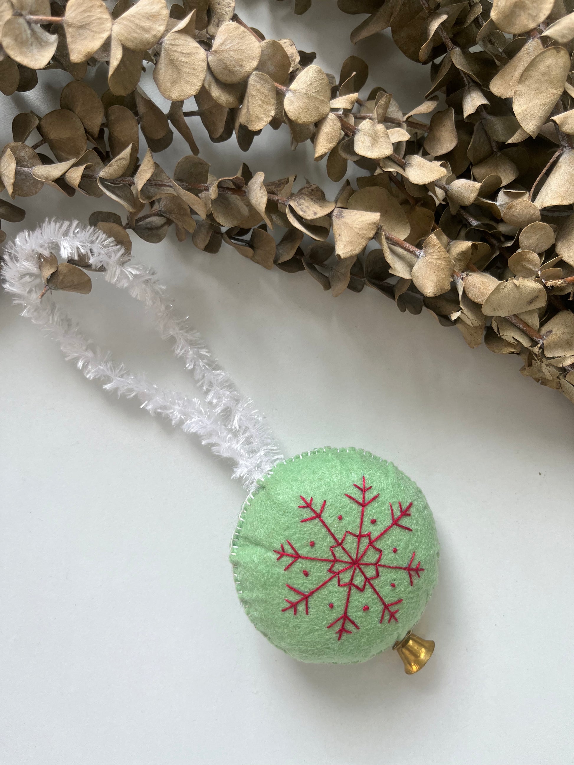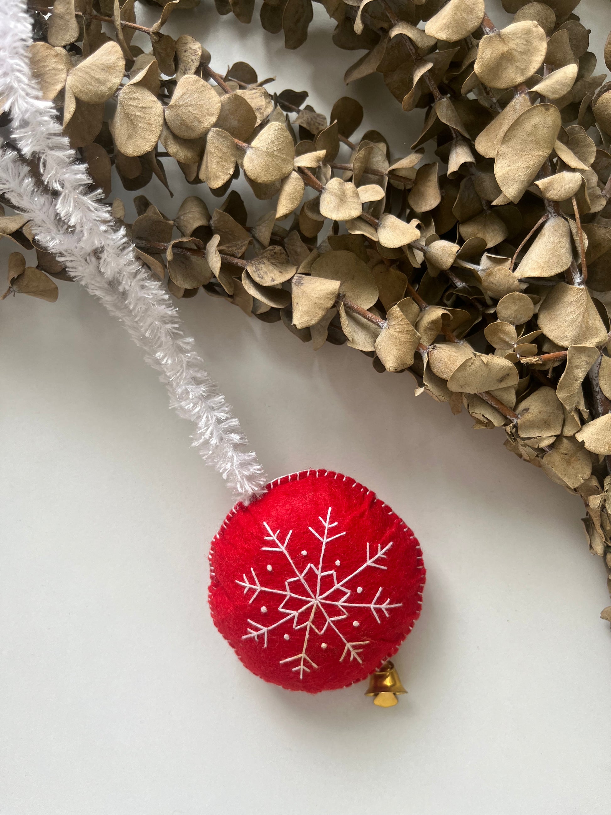 Crafted from felt, this charm features a stunning, intricately embroidered red snowflake design that pops against the background. It's finished with a white tinsel pipe cleaner loop for easy hanging.
