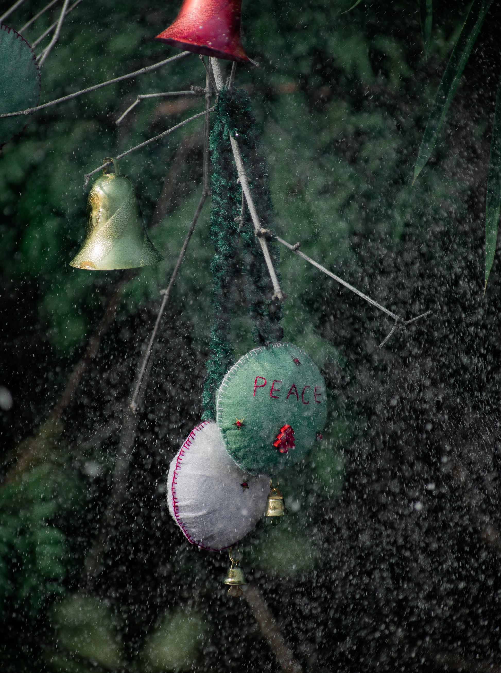 Crafted from soft, light felt, this ornament features the word "HOPE" or "PEACE" embroidered in festive red, accented with tiny star details. It's adorned with a sweet little red tree charm and finished with a classic jingle bell for a touch of cheer. The ornament hangs from a fluffy green tinsel pipe cleaner loop.