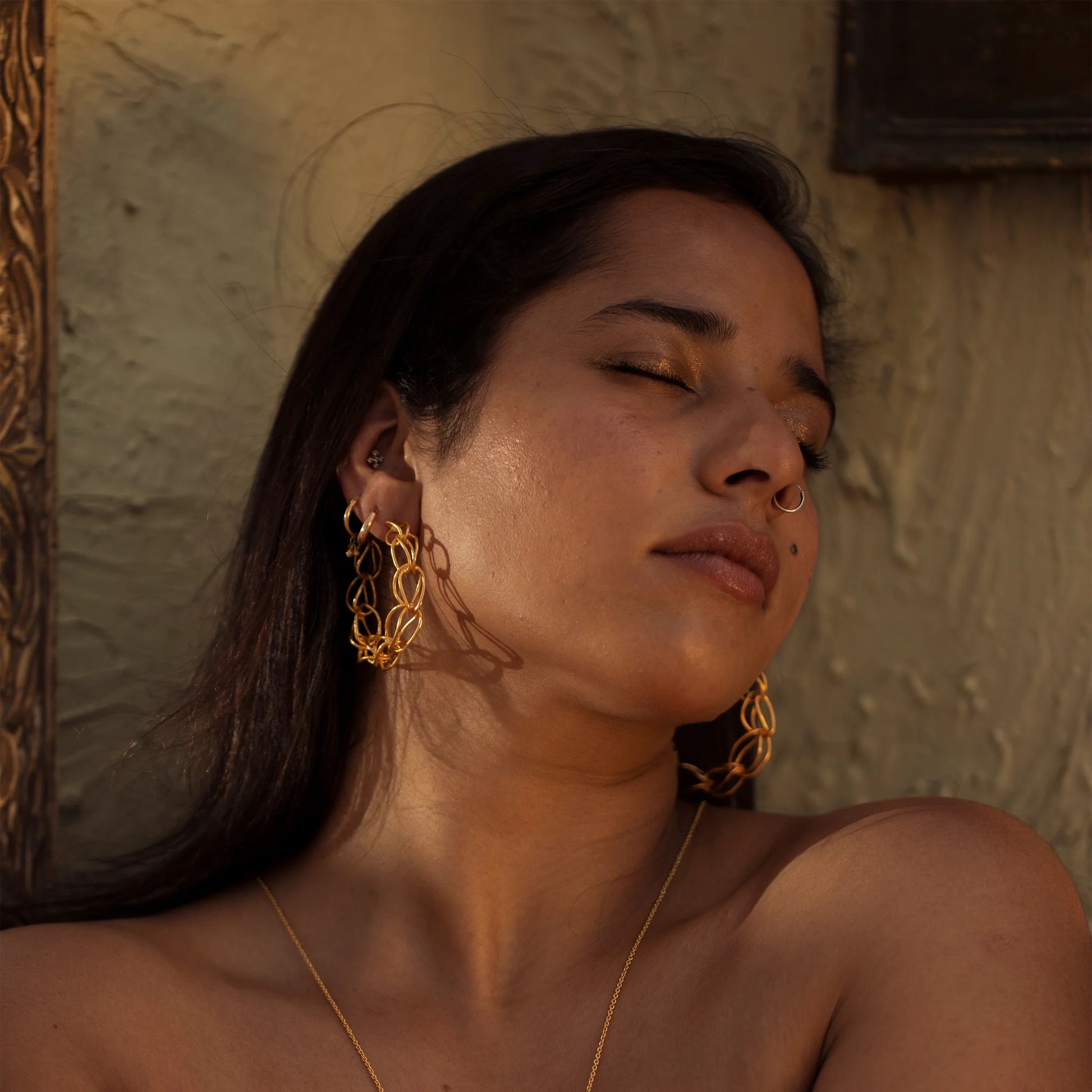 Cast in brass and plated with 18k gold, the Kadhee Hoops are a modern spin on an ancient technique of making a link chain.