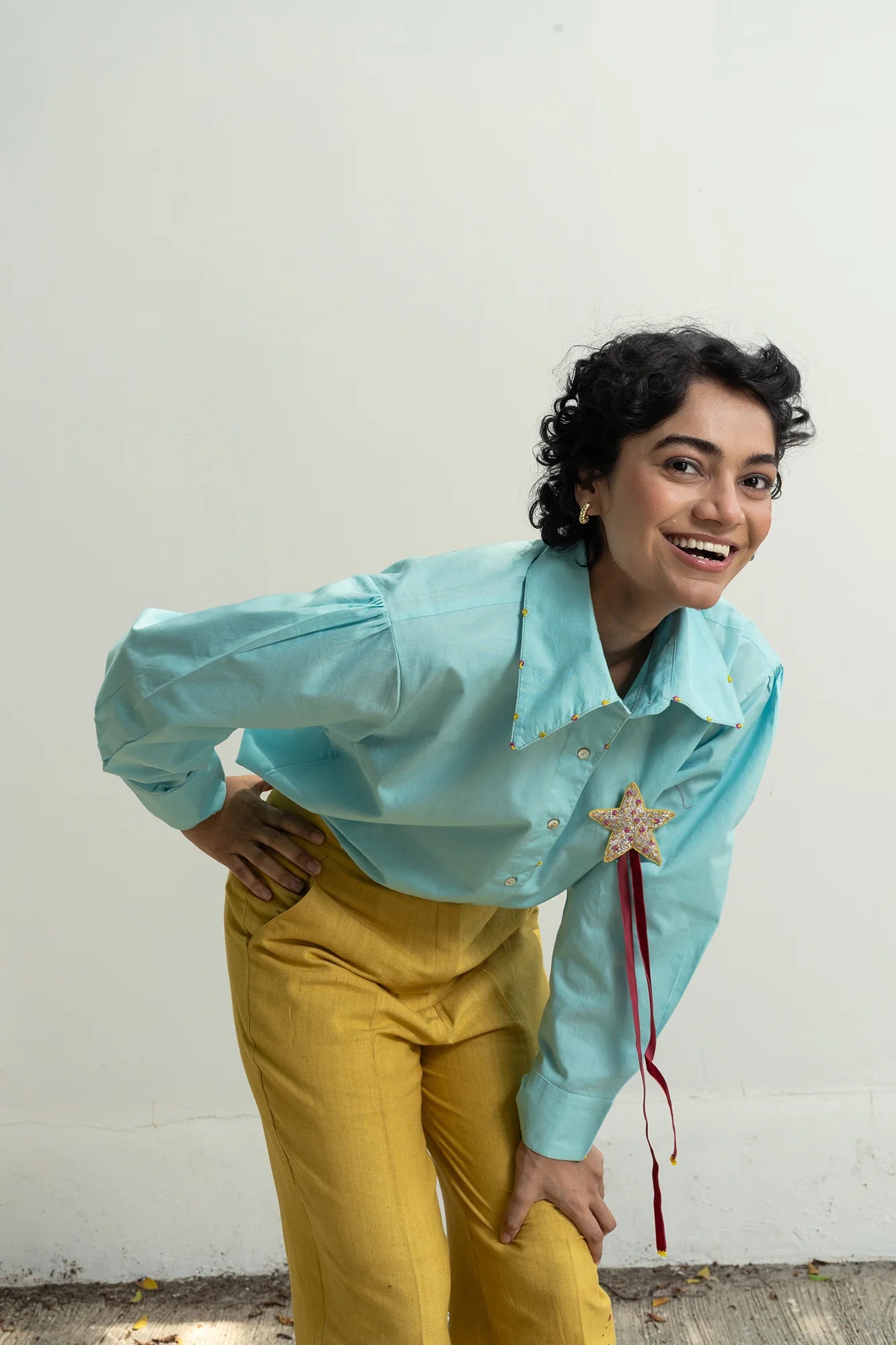 Blue poplin shirt featuring an oversized collar and cuffs, with soft gathers on the sleeves. A signature star brooch embroidered with fine dabka, sequins, and finished with a velvet ribbon sits playfully on one side, adding just the right touch of charm.