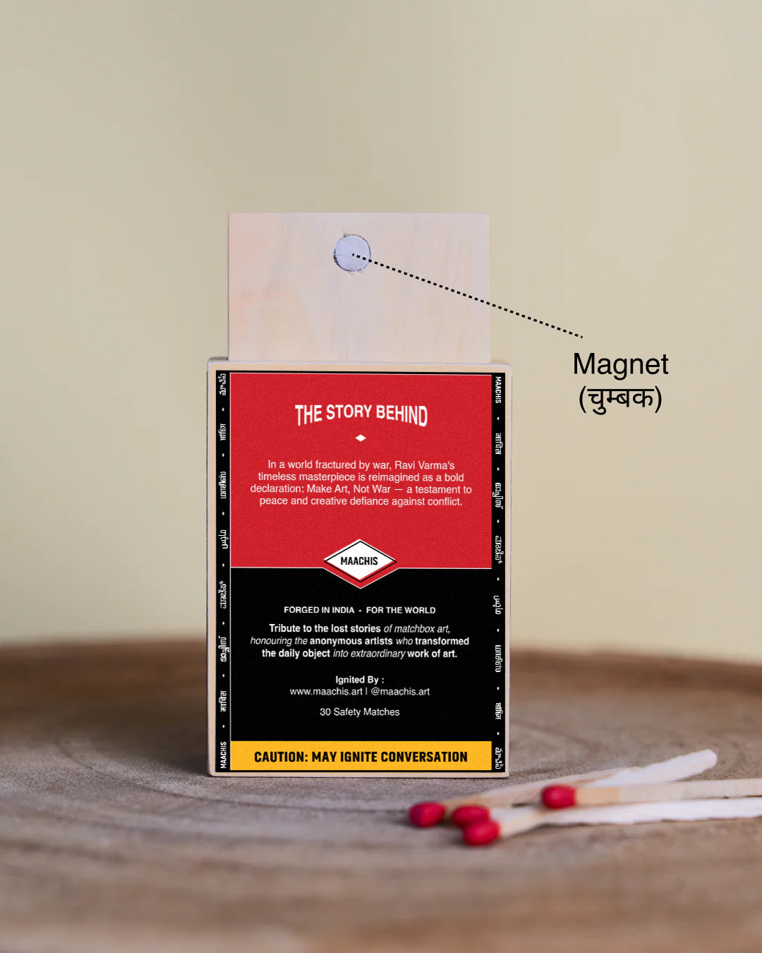 In a world fractured by war, Ravi Varma's timeless masterpiece is reimagined as a bold declaration: Make Art, Not War — a testament to peace and creative defiance against conflict.