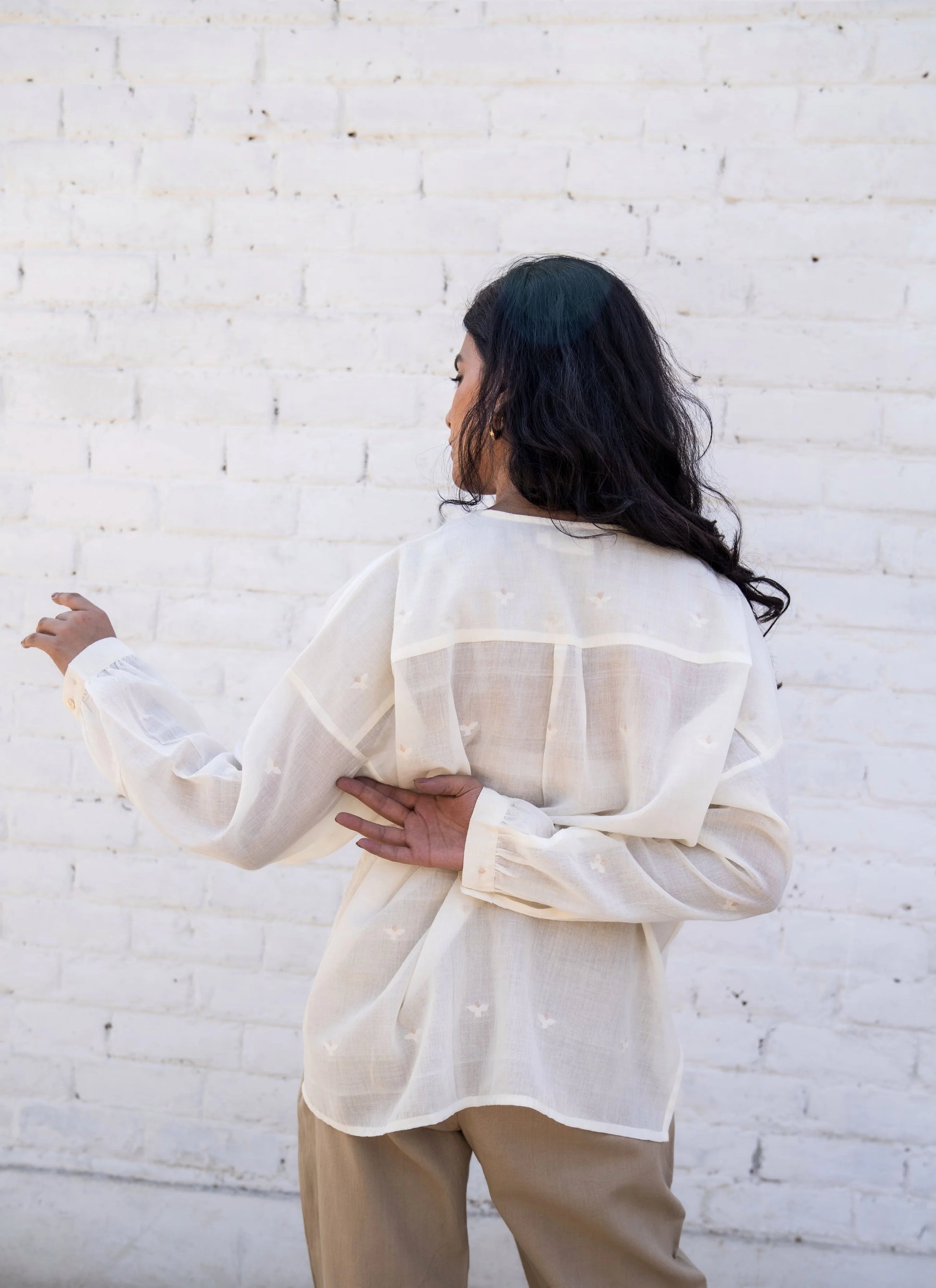 A collarless oversized shirt in textile that flows like a river, reminds you of the softness of its flow. Bearing Jamdani motifs in white with a hint of zari. Comes in dual sizes. Transparent, may need a slip.