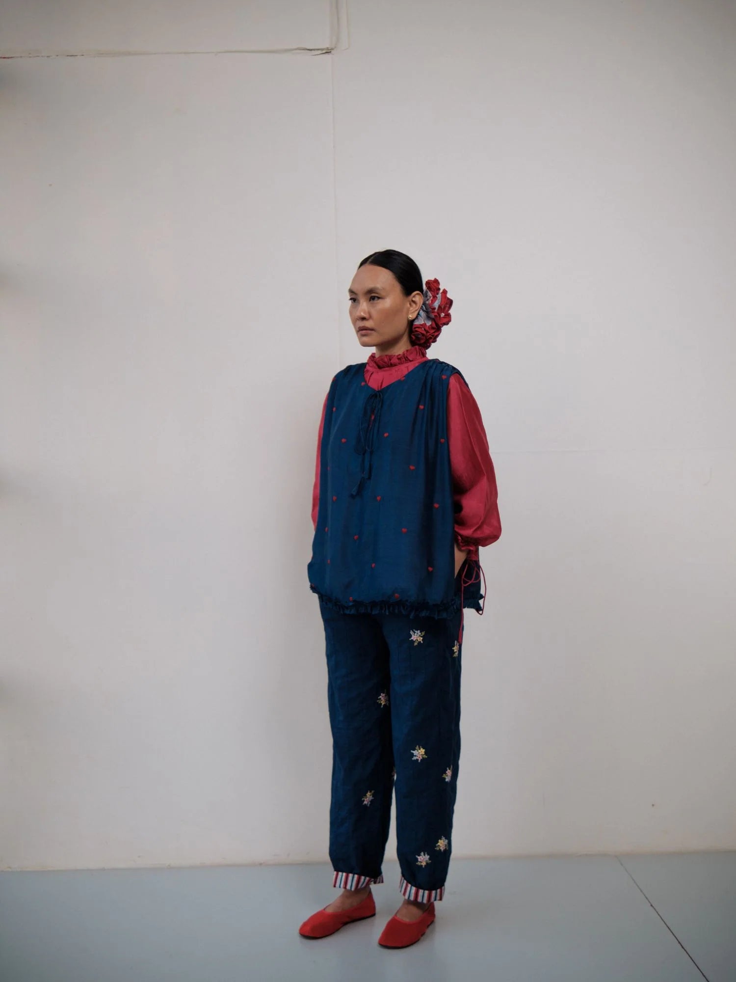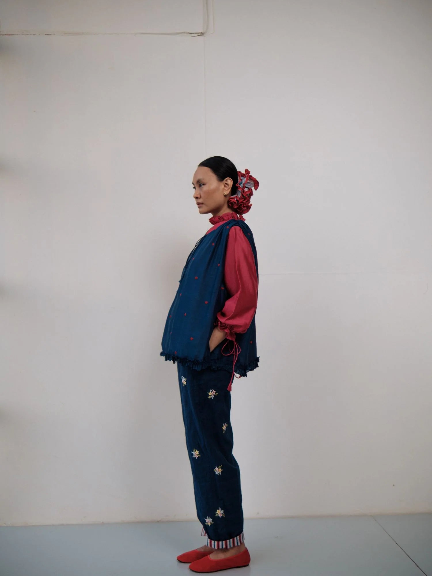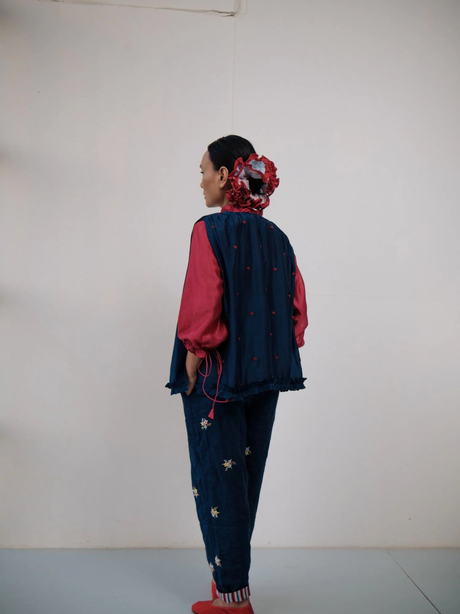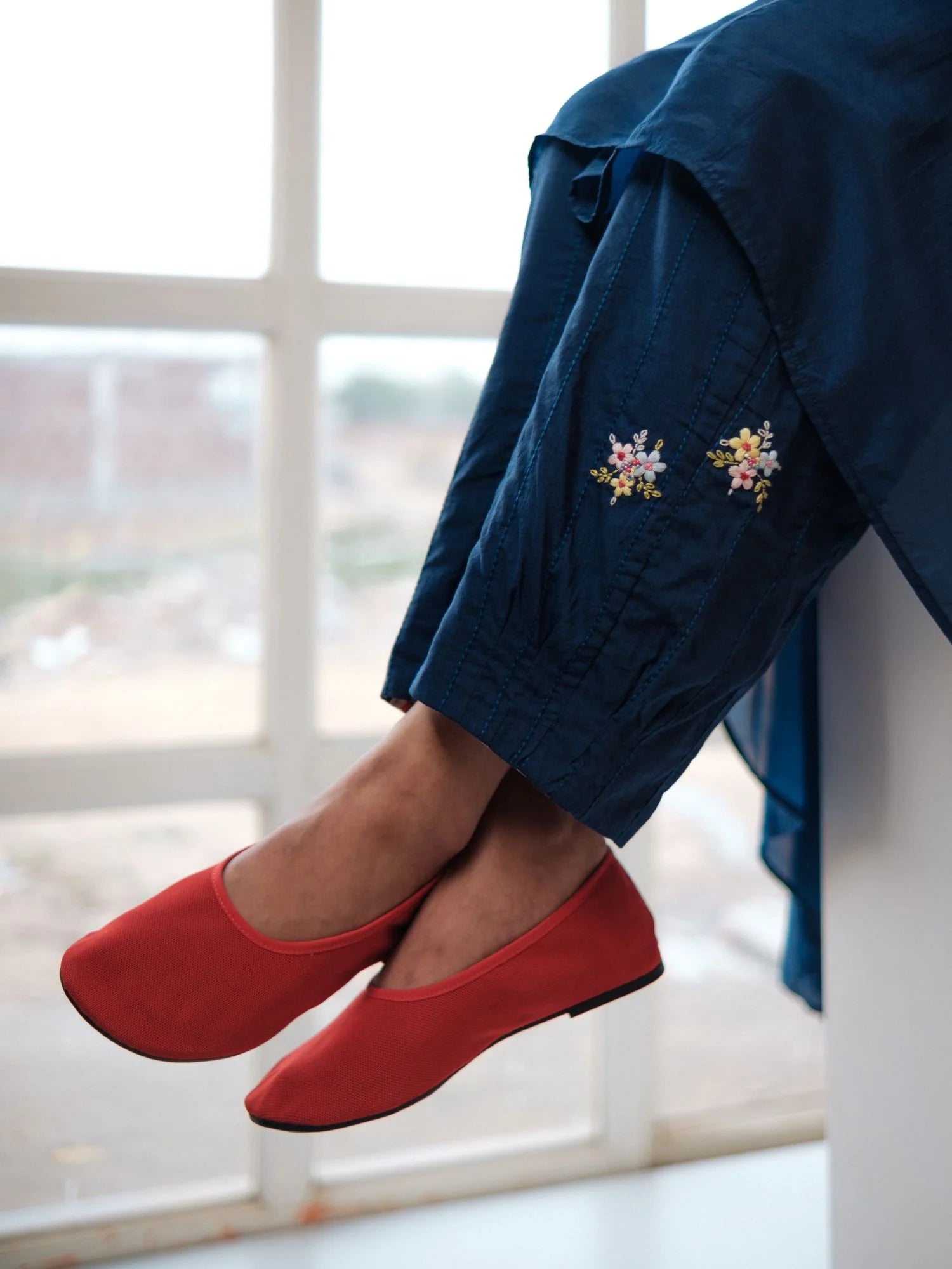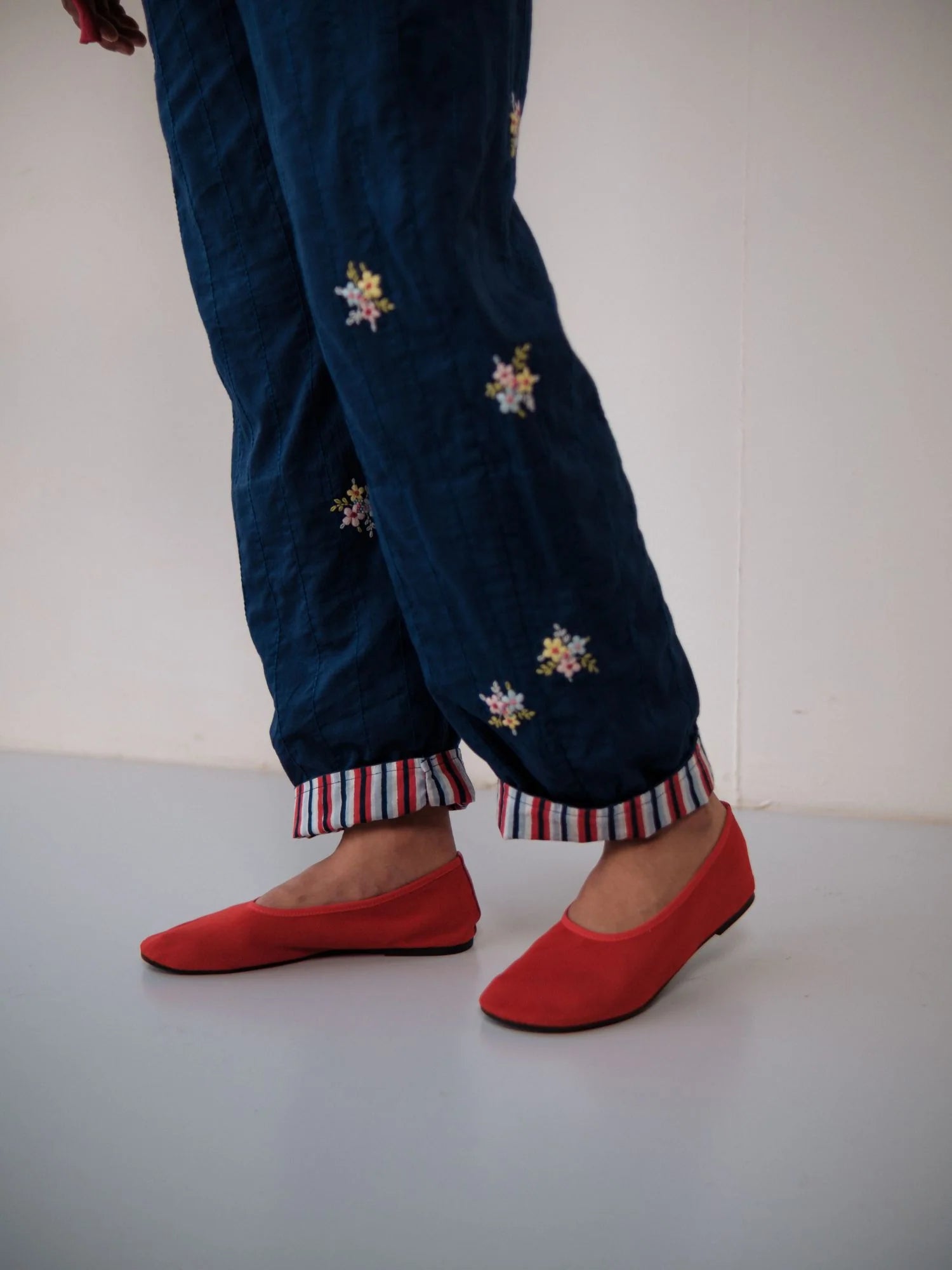 Double layered cotton pants with bunches of flowers hand embroidered on them and hand-block printed cotton turn up detailing at the bottom.