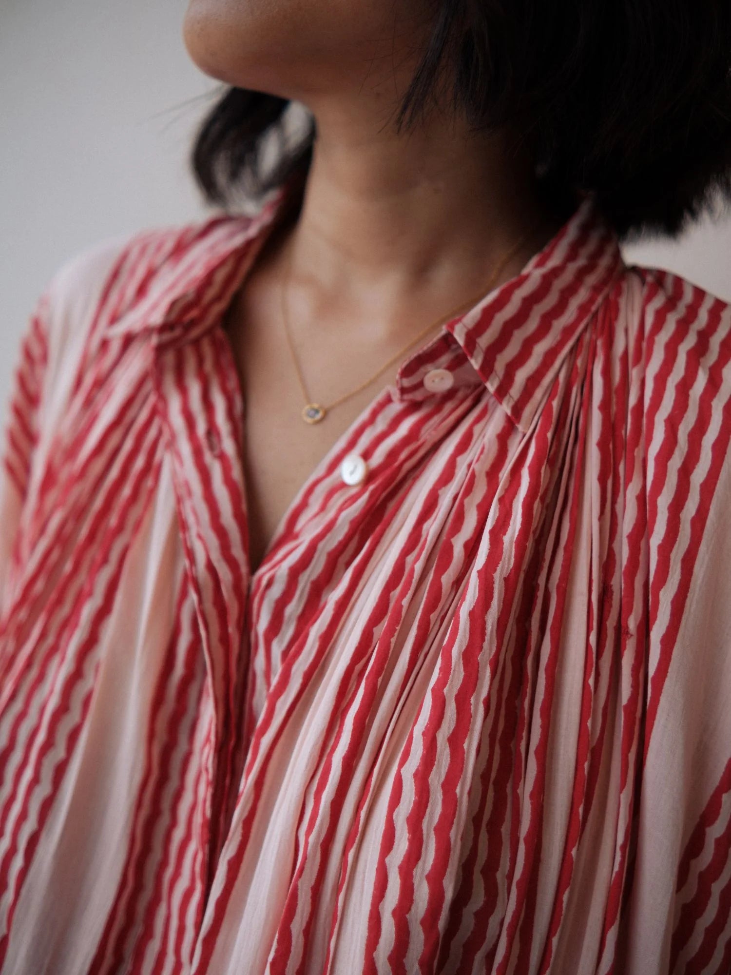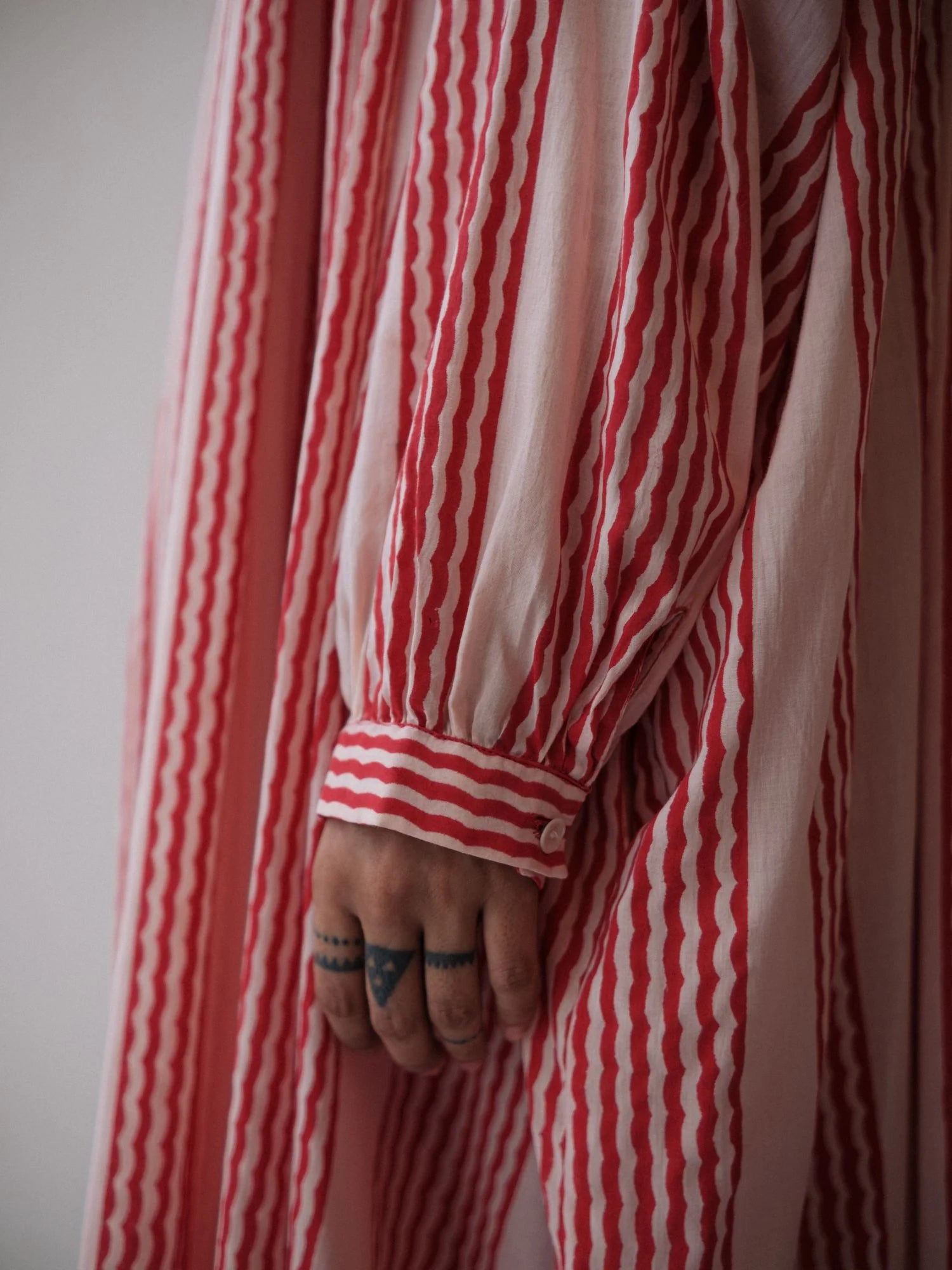 This shirt-style dress is made with hand-block printed cotton, has mother of pearl buttons on the front and cuffs and has an easy fit. The placket reaches up to the waist.