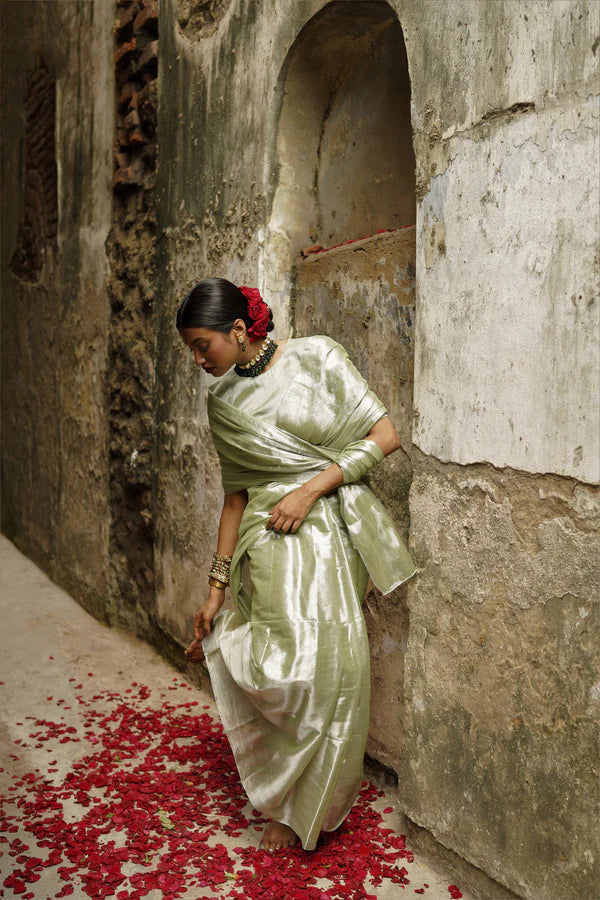 Meticulously crafted over two days, this exquisite handwoven tissue saree is a celebration of grace and timeless elegance. It features a delicate pastel pista hue that radiates softness. The lightweight and sheer texture of the saree drapes effortlessly. Perfect for any occasions, this saree blends traditional craftsmanship with contemporary charm.