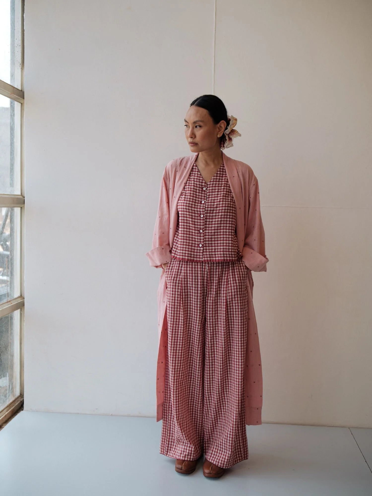 The Rosa top is made in handwoven kala cotton fabric with hand embroidered buttonholes and finished with mother of pearl buttons.