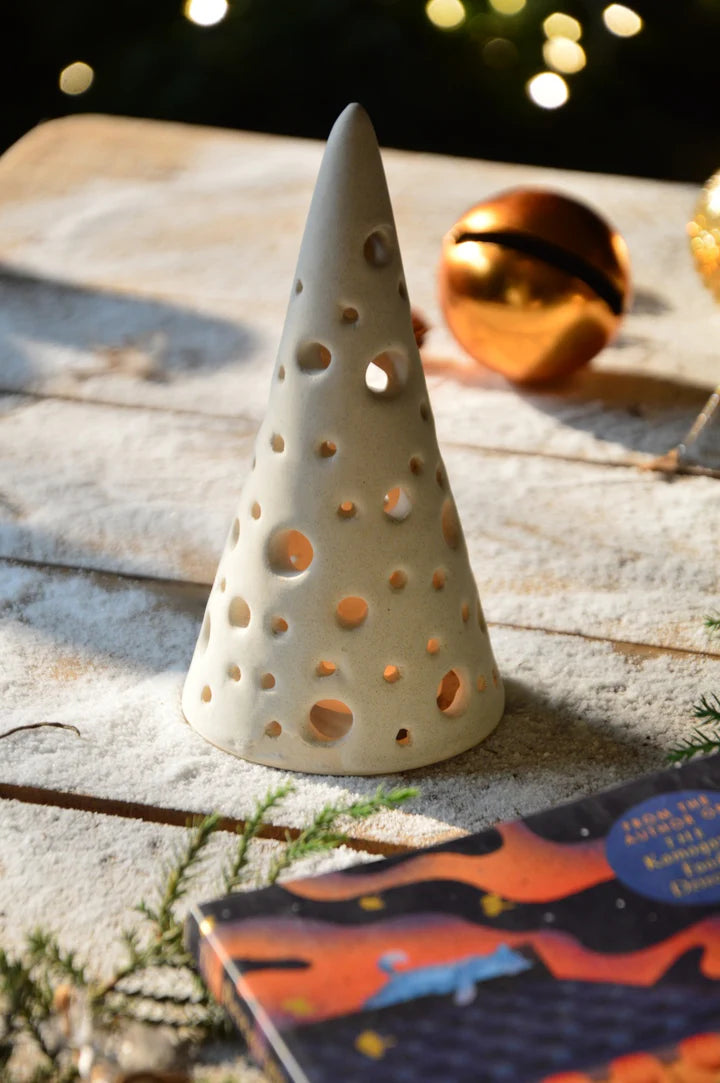 Ceramic Christmas tree t light holder, a bundle of silver shimmer candles, a wooden log holder and a handknit snowman ornament in a cozy woolen bucket bag that jingles
