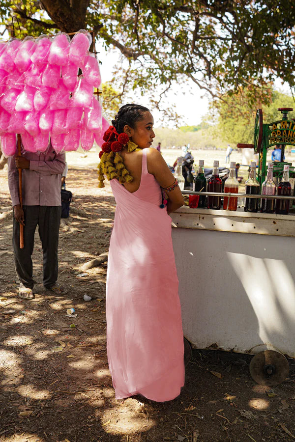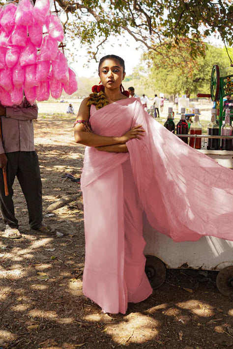 Wrap yourself in sweet nostalgia with this soft pink saree. It's the embodiment of playful summer days and childhood laughter. The color evokes the delightful mix of sweet and tangy strawberry ice gola, a taste that never fails to bring back memories of carefree summers. Remember the way the vibrant pink syrup stained your lips a playful shade? This saree captures that carefree spirit, a reminder of the simple joys that made your childhood summers unforgettable.