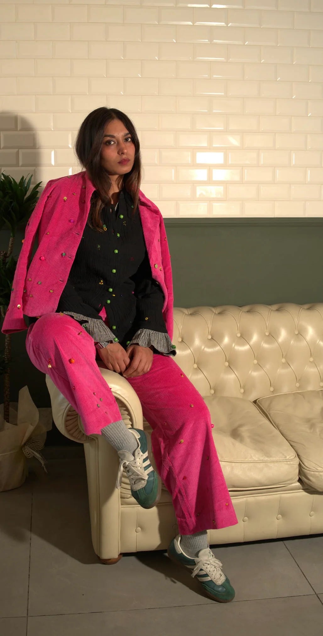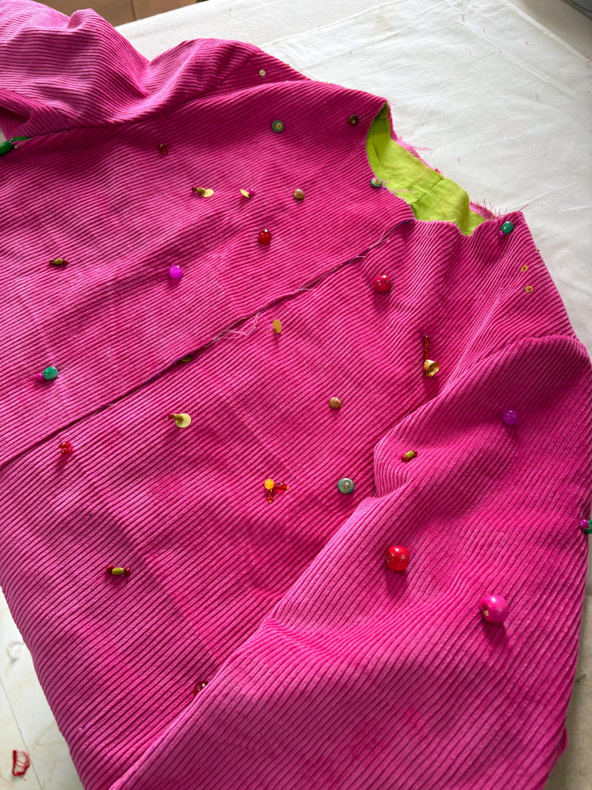Sweet Tart is a short pink corduroy jacket adorned with beautiful oversized beads, sequins, and other embellishments, arranged in a playful, random pattern.